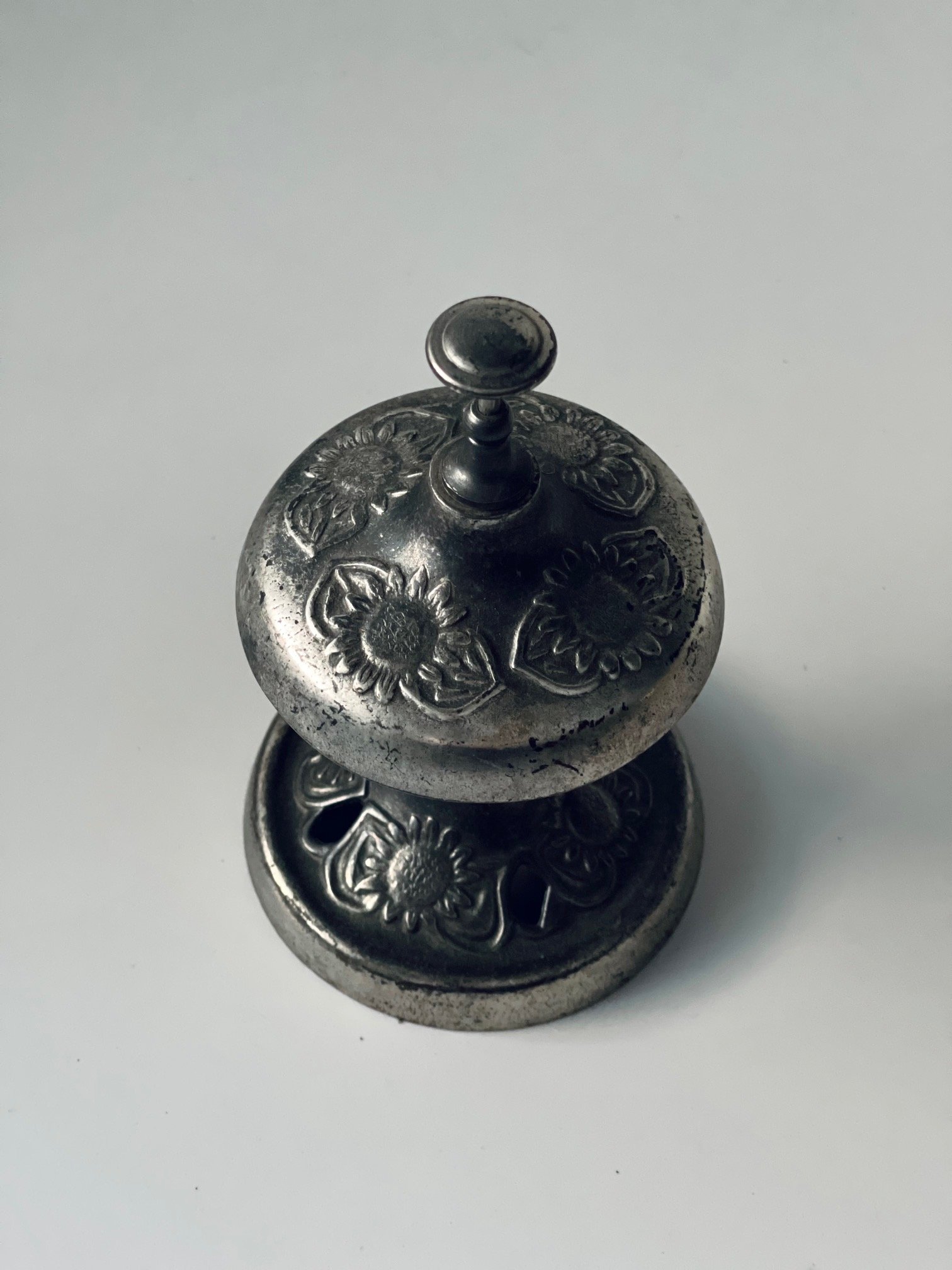 Lovely ornate vintage shop /hotel bell with embossed flower/sunflower design and punched detail on base